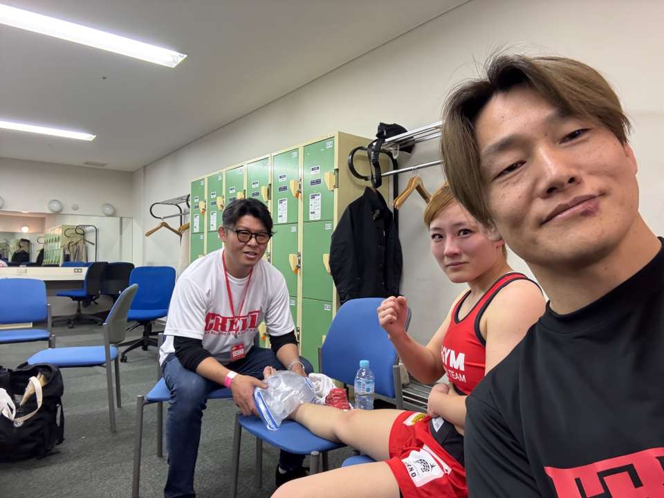 いつもセコンド、バンテージ巻きしてくれる内藤さんありがとうございます。足を負傷しましたが、翌日検査をしたところ骨折はしてなかったです。